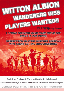 Witton Albion U15 Wanderers – Players Wanted! Looking for more game time? We’ve got space in our squad! We train Fridays, 6–7pm at Hartford High SchoolOur matches are ...
